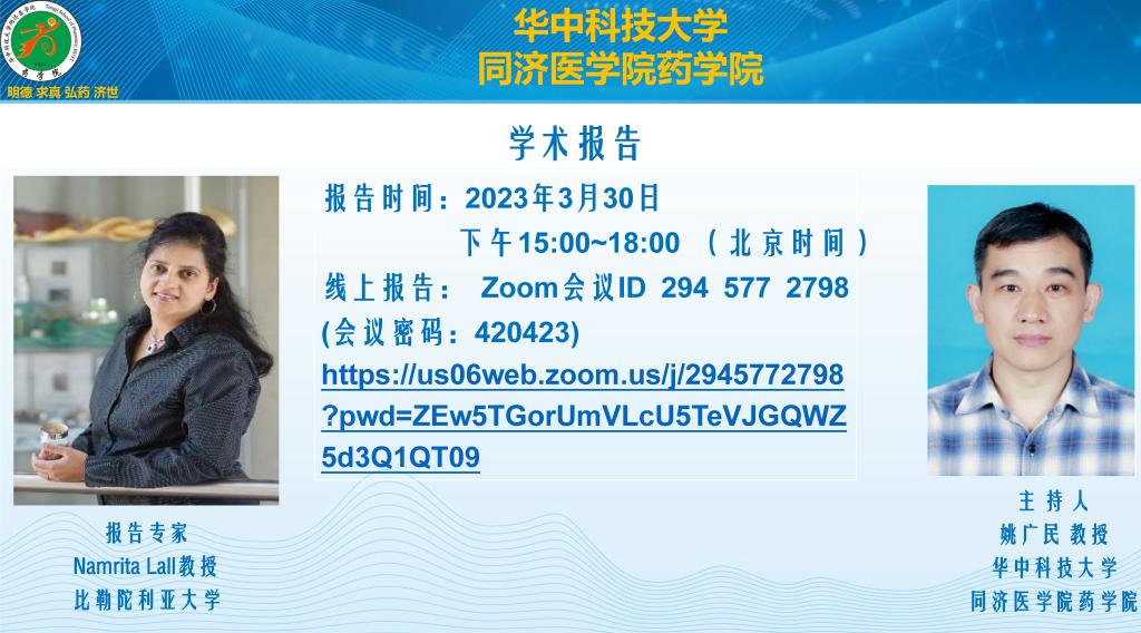 2023年3月30日,应药学院姚广民教授邀请,南非比勒陀利亚大学(University of Pretoria)Namrita Lall教授在Zoom会议平台上(会议ID 2945772798, https://us06web.zoom.us/j/2945772798?pwd=ZEw5TGorUmVLcU5TeVJGQWZ5d3Q1QT09)为全院师生做了题为“Natural solutions for health and beauty products”的精彩报告。报告会由姚广民教授主持,药学院32名师生在线参加。