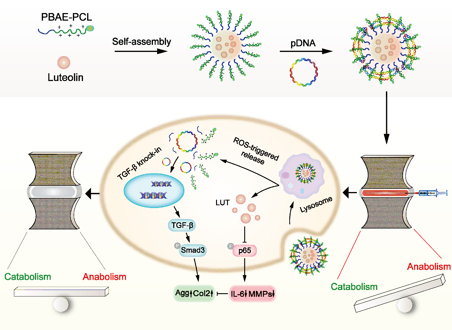 自1999年以来,研究人员一直在探索基因治疗作为IDD治疗替代方案的可行性,尽管病毒载体在IDD基因治疗中展现出了积极的效果,但其安全性/副作用仍然是限制其应用的关键问题。为此,团队设计了一种兼具功能模拟(慢病毒骨架质粒递送)和结构模拟(核壳结构)的类病毒基因递送系统用于TGF-β1质粒和中药有效成分木犀草素(LUT)共递送。该系统在椎间盘局部能有效实现缓控释放,体内外均表现出高转染效率,且对髓核细胞几乎没有毒性。该类病毒纳米粒一方面通过抑制COX-2和IL-6表达从而抑制炎症和分解代谢,另一方面通过TGF-β1过表达提高Col2和Agg水平,恢复合成代谢/分解代谢平衡。LUT和TGF-β1过表达的协同作用在大鼠IDD模型中取得良好效果,没有明显的局部/全身毒性,为IDD的治疗提供了新的思路。