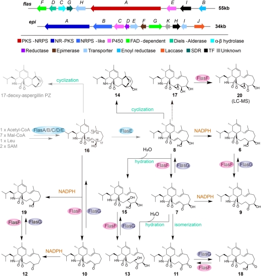 图1.flas和epi基因簇信息及细胞松弛素单体变换网络