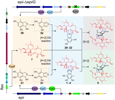 最后,亲双烯体7与双烯体51(或52)之间,可以通过级联的非酶促[4π + 2π] Diels-Alder反应和[5π + 2π]环加成反应,逐步产生mAPOs二聚体和三聚体。而epi簇中的黄素依赖氧化酶EpiG催化双烯体C3位的羟基化,这是形成mAPOs三聚体的关键步骤。