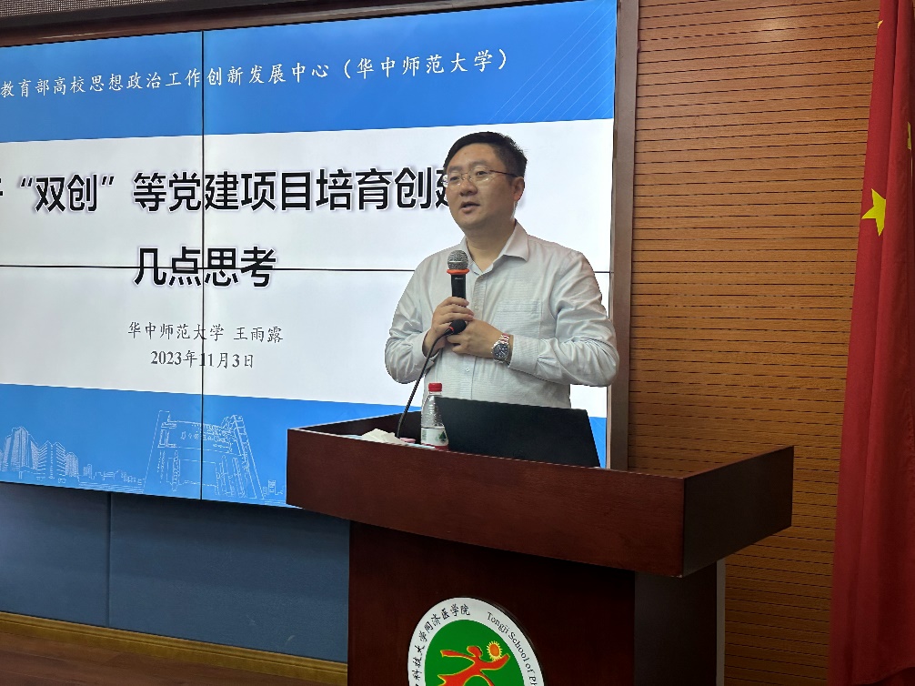 华中师范大学信息管理学院党委书记王雨露做“双创”党建项目培育创建工作指导。他分享了“双创”、“双带”、“双百”等培育工程的实施背景及意义、培育工程的实施现状、项目培育创建路径探讨、项目申报步骤,以及项目验收评估的工作机制。他指出党支部的发展需要所有人承载,党支部书记不仅要发展自己,更要起到榜样带动作用。可以将党建和学科相结合,更好地发挥“党建+”的作用。在组织生活开展过程中,要在党言党,要传播思想信念,富有战斗力,开展活动不是“负面清单”,而是锦上添花。