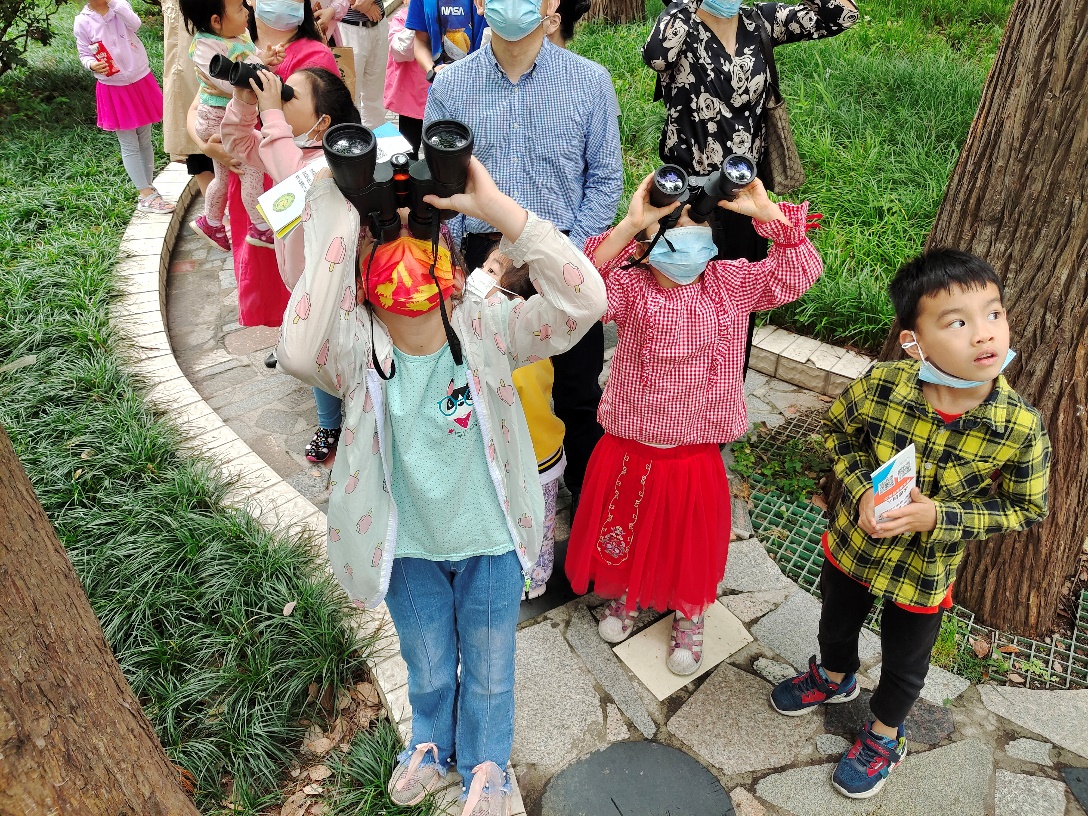 “观鸟的第一步,是学会聆听鸟儿的歌声”,来到宝隆广场的小树林,“小药二代”们打开耳朵聆听。“这是白头鹎的鸣唱,这是灰喜鹊在警告路过的我们,这种单调的吵闹声音是黑脸噪鹛的叫声,它现在就在我们头顶……”学会了第一步,“小药二代”们纷纷举起望远镜,尝试在茂密的枝干中找到跳跃的鸟儿。“看那边地上有一只珠颈斑鸠在走路,它旁边的树上站了一只全身黑色的鸟,名字叫乌鸫。”孩子们第一次在这么近的距离仔细观察鸟,太过兴奋以至于走得太近吓跑了小鸟。王教授发现了几只灰喜鹊在不远的树上梳理羽毛,大人和小孩都抬头观察,大人们看起来也是兴趣浓厚。