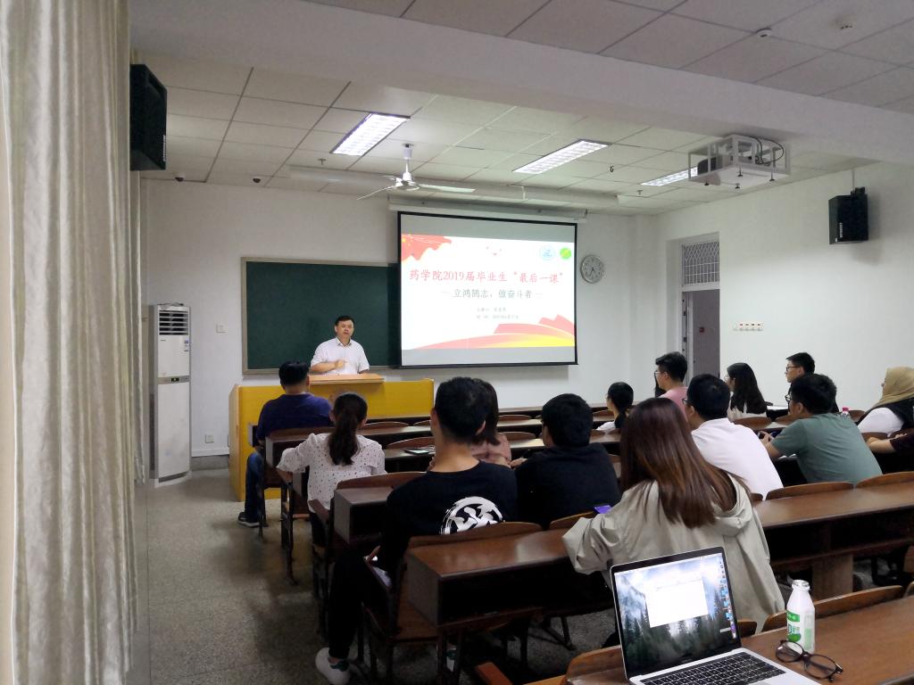 6月17日下午,在一号教学楼七小教室药学院院长张勇慧以”立鸿鹄志,做奋斗者”为题,与毕业生进行了心与心的交流,为2019届毕业生上了难忘的“最后一课”。学院副书记周正航、辅导员赵红艳及全体毕业生参加了本次思政课。