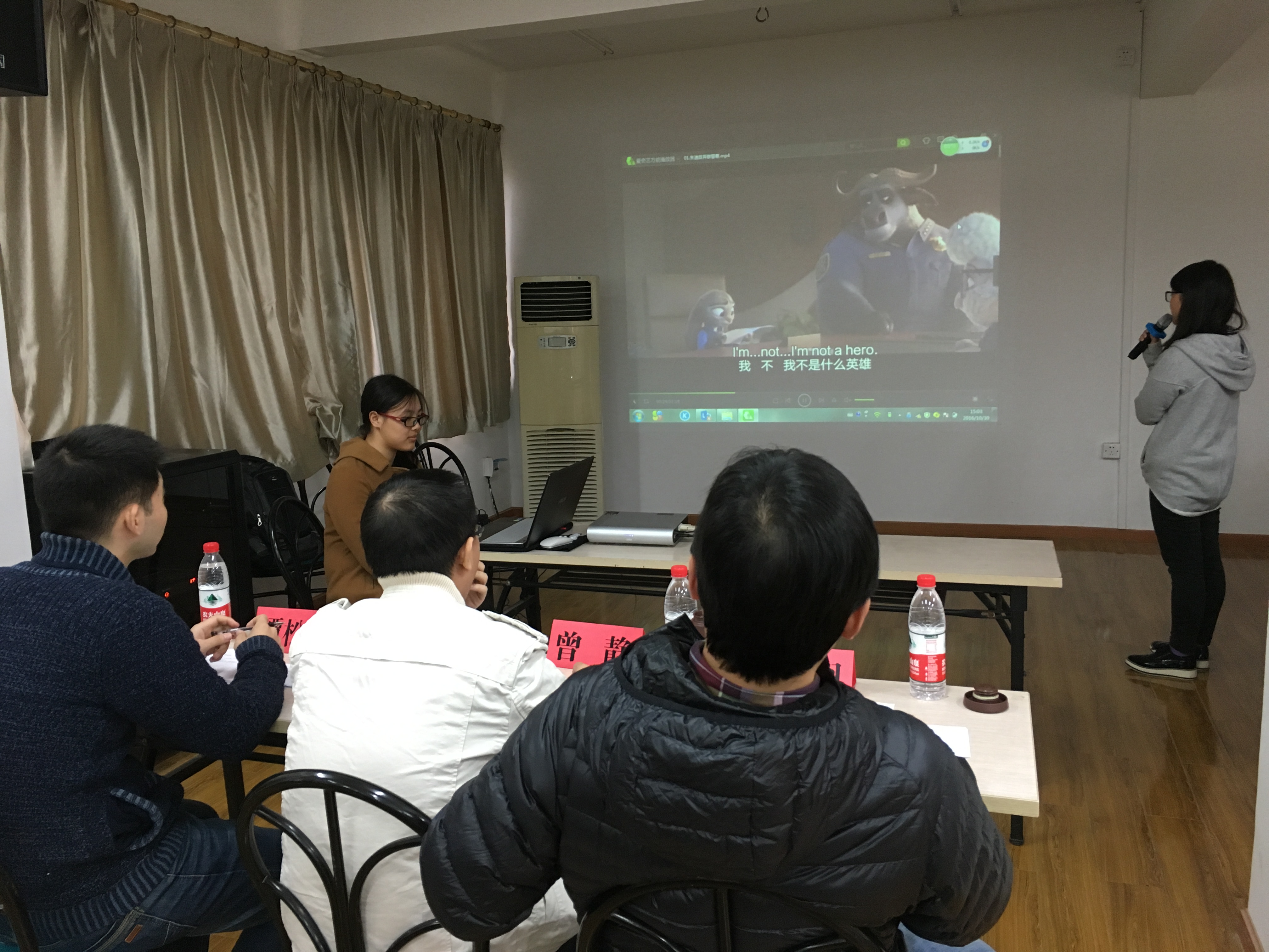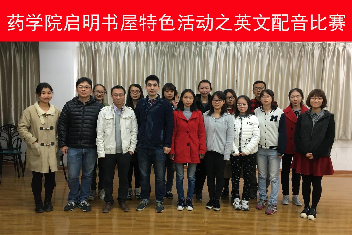 为了点燃学生对英语的热情,提高大家的口语表达能力,丰富同学们的业余生活,10月30日下午3点,“药学院启明书屋特色活动之英文配音比赛”的决赛在507栋6楼活动室成功举办。本次比赛邀请到药学院三名老师马翔、曾静、谭松巍担任评委,根据选手的发音、感情和节奏进行现场打分,药学院分团委书记梅浩和各年级学生代表出席了本次比赛。