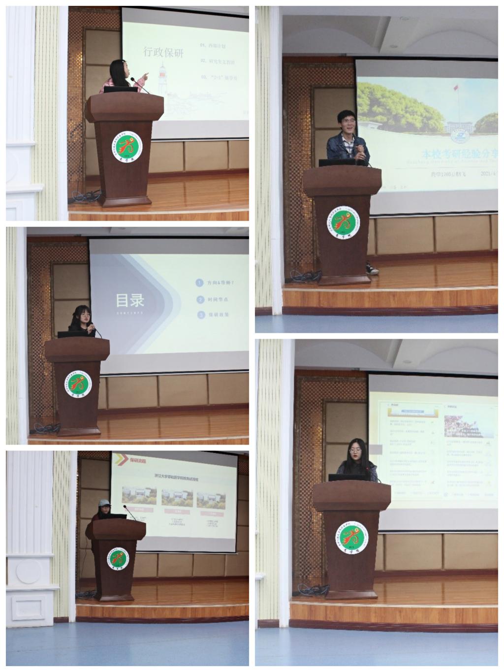 经验分享环节,马小敏向在场学生介绍了选择西部计划等相关政策的注意事项,通过自己的经历总结了相关的重要时间节点、条件以及笔试和面试的经验;崔可鑫介绍了保研的时间节点、本校保研政策并分享了联系导师的方法以及面试的技巧;李荣则介绍了保研信息来源、夏令营流程以及面试内容及经验;豆鹏飞向在场同学推荐了部分优质考研资料,并强调了往年试题的重要性;李琪主要回顾了自己的保研历程,特别强调了英语的重要性,并鼓励大家努力将英语学好,特别要留意导师的邮件,对于保研要多选择、多了解,丰富自己的信息来源。