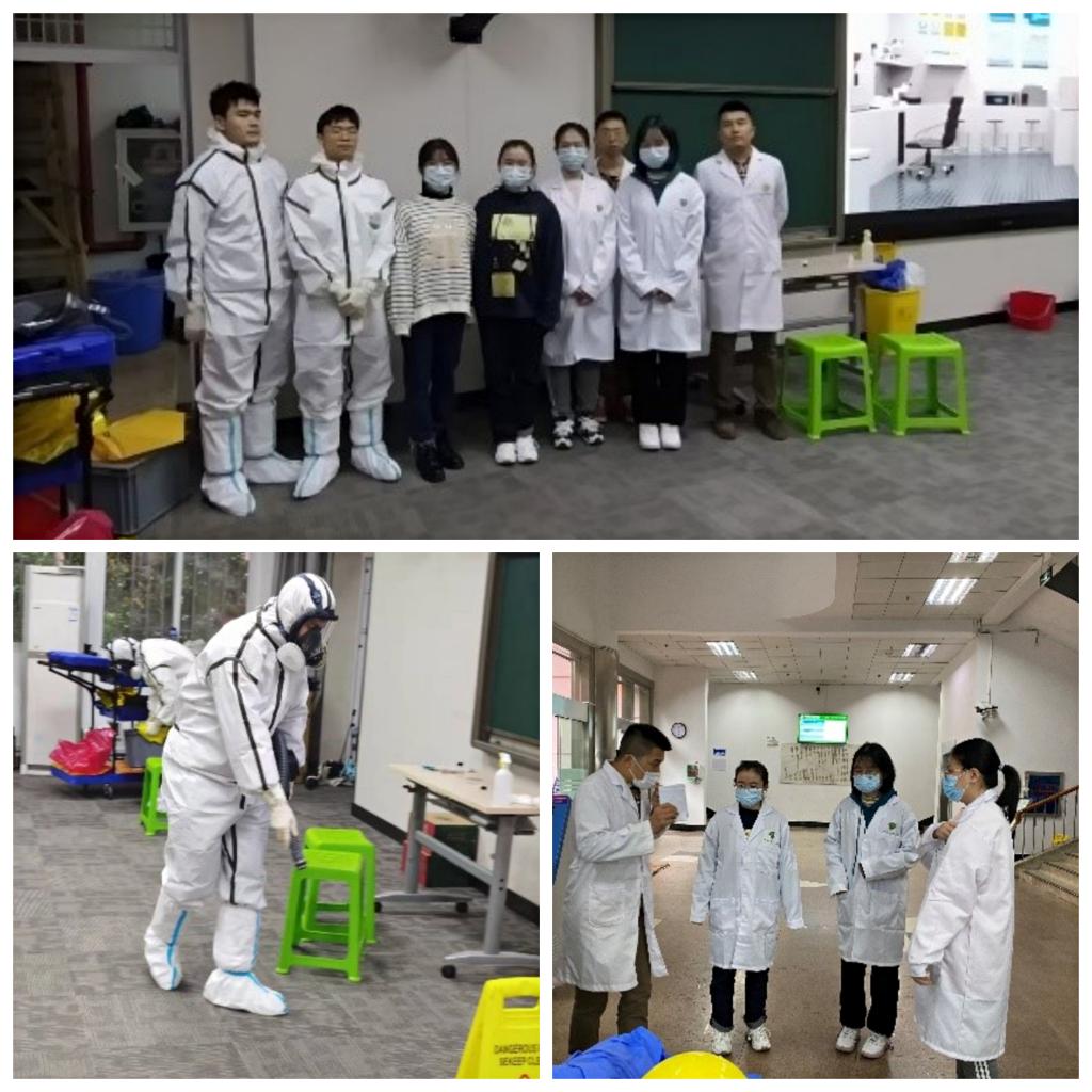 接下来的生物应急演练由我院协同组织安排,演练人员由我院7名研究生分饰不同角色。应急演练环节模拟了某高校实验室在生物实验过程中突发病毒泄漏事故,该实验室及学校职能部门相关人员采取正确方式进行应急处置的整个过程,演练重现了事件发生后事故上报、人员急救、灭菌消杀、废弃物回收、事故处理等各环节工作。