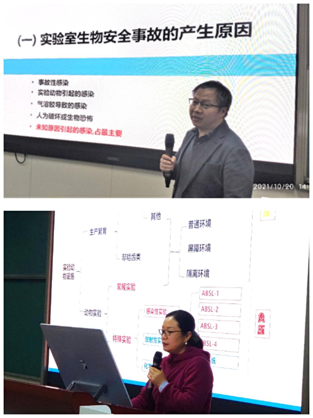 基础医学院首席安全专家范雄林教授做了题为“实验室生物安全”的精彩报告。他用一个个鲜活的案例提高了大家对生物安全重要性的认识。他结合几十年从事病原生物教学及科研工作的经验,总结了生物实验室的“四有”管理理念,即:有制度、有设施、有培训、有记录。随后,同济医学院实验动物学部的叶明霞老师做了“动物实验生物安全管理”的报告。她强调,教学实验一定要对实验动物的来源严格管控,必要的实验防护措施不可少,同时要加强个人安全意识,实验废弃物应妥善处理。同时她还提到,实验动物被用来验证一个又一个的生命科学真理,希望大家在做动物实验的时候,务必遵从动物伦理,善待实验动物。