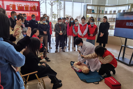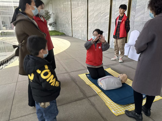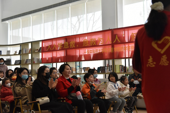 在急救演示环节,许多孩子家长自发拿起手机,拍下PPT上的急救要点和志愿者们的演示过程,并不由自主地跟随志愿者一起,同步模仿志愿者们的急救动作。在有奖竞答环节,居民们踊跃举手,现场掌声连连,欢声笑语不断。