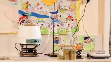 在叶茂老师绘声绘色的讲解下,小朋友们认识了金银花的重要成分挥发油,并开始制作金银花露。首先是将金银花加入水中蒸馏,收集蒸馏液。小朋友们争先恐后地闻了金银花蒸馏液的神奇味道。随后,称取适量蔗糖,将其与金银花蒸馏液混匀,再加入适量亲手挤出的柠檬汁,酸酸甜甜的金银花露就制备完成了。现场活动热烈,小朋友们都迫不及待地品尝了自己亲手制作的金银花露。