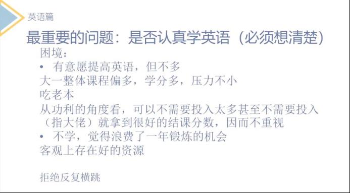 英语课:准备积累本,积少成多,最好坚持每日单词打卡,重视四六级并多练口语,可以看英剧美剧磨听力,若有精力便可以积极参加各类竞赛,如大英赛,外研社比赛,提高对英语的重视程度,以后阅读文献,撰写文章都需要较高的英语水平,也可以多练习一下翻译。(徐珈妍)
