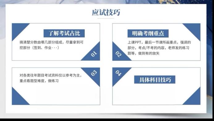 了解考试占比,尽可能拿到可控分数(如签到、作业等平时分);明确考纲重点,做到有的放失;参考往年题型,重点看题型难度,做练习;明确具体每个科目复习技巧。