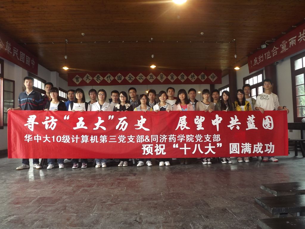 在中国共产党第十八次全国代表大会即将召开之际,以“喜迎十八大”为大背景,药学院2010级党支部全体党员友联主校区计算机学院2010级第三党支部全体党员,于2012年10月21日在武汉市武昌区红巷举办“寻访‘五大’历史,展望中共蓝图”为主题的红色寻访活动。