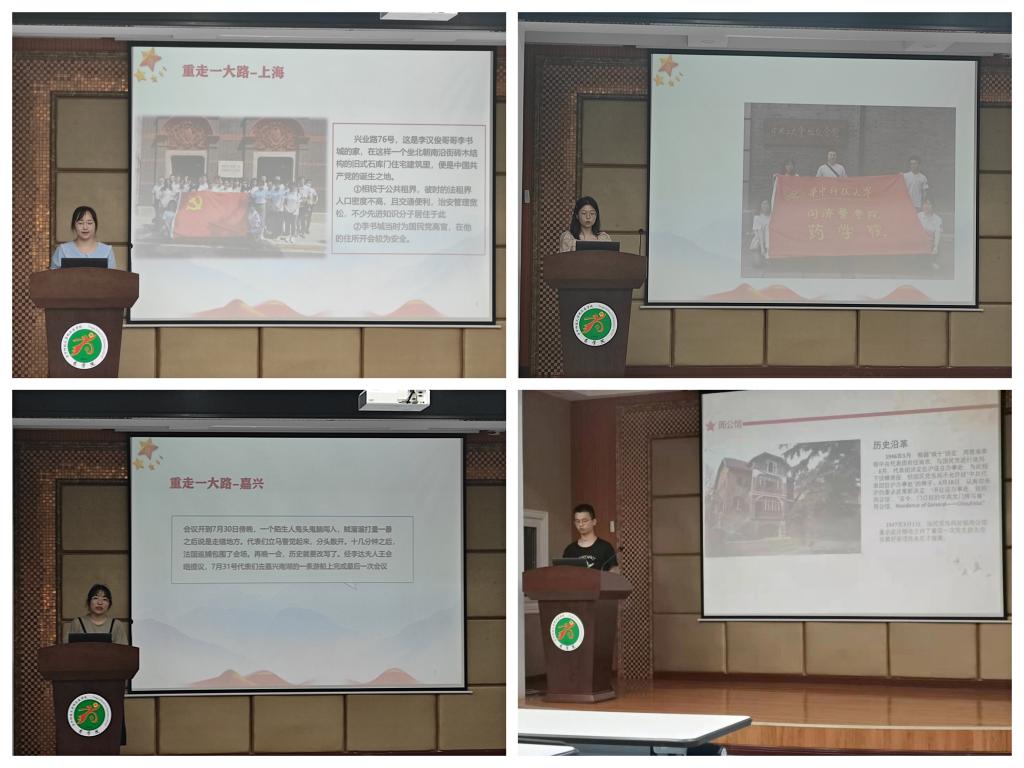 会议伊始,程冰瑀、刘晗、杨钟睿、谢祚业四名同志依次上台对上海的中共一大会址、中共二大会址和中共驻上海办事处“周公馆”和嘉兴南湖红船的历史沿革和精神内涵作出深刻阐述:程冰瑀以十三名青年共产党员为导入,讲述了中共一大在上海兴业路76号召开的过程,把这段开天辟地的历史面貌全面地展现在党员的面前;刘晗则围绕嘉兴南湖红船,深刻阐述了敢为人先、百折不挠、立党为公的红船精神;随后杨钟睿介绍了为新生的中国共产党指明方向的中共二大;谢祚业同志则讲述了“周公馆”内,中共早期领导人们为谋求和平建国、避免内战而与狡猾的反动派斗智斗勇的故事,彰显了共产党人甘为国家与人民舍生取义的英雄气魄。四名党员的汇报内容围绕党史背后鲜为人知的故事,生动展现了革命先辈们的个性和风骨,百年前风云变幻的时代历历在目。随后,四位同志结合上海和嘉兴之行的所见所感,通过具体事例的感触和思考,分享了自己在阅读《中国共产党简史》、《习近平新时代中国特色社会主义思想学习问答》以及《毛泽东 邓小平 江泽民 胡锦涛关于中国共产党历史论述摘编》等书籍的学习体会,并与在场同志进行了热烈交流。
