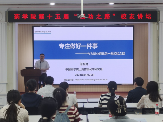为做好对学生的生涯规划指导,激发学生爱校荣校之情,2024年4月25日下午,学院在药学院三号楼5楼会议室举办了第十五届“成功之路”校友讲坛。本次讲坛邀请到中国科学院上海有机化学研究所何智涛教授、中山大学化学学院冯强教授两位杰出校友,向学院学生分享在求学和工作中的宝贵心得。学院党委副书记李进、学生办公室主任上官小芳、研究生辅导员张心语、本科生辅导员杨瑞参与本次活动。