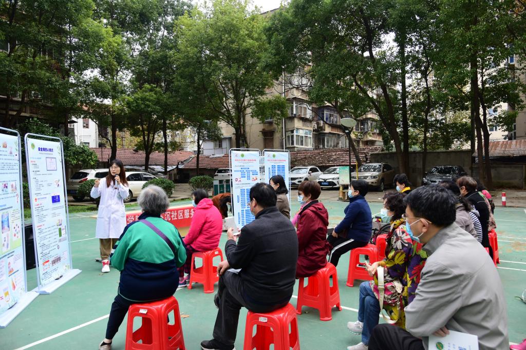 上午9:00,教师党员及学生志愿者提前来到同济宝丰小区,现场布置完成后,小区居民陆续到来。药学院龚时薇围绕突发公共卫生事件类型,讲诉了不同突发公共卫生事件的应急救治药物,并教大家在自然灾害、传染病和新冠肺炎中如何进行家庭应急准备。李伟杰则是从安全用药的角度,详细讲解了药品选购、药品储存和常见病药物的合理使用等。现场居民反应热烈,讲解结束后纷纷与在场老师进行交流。