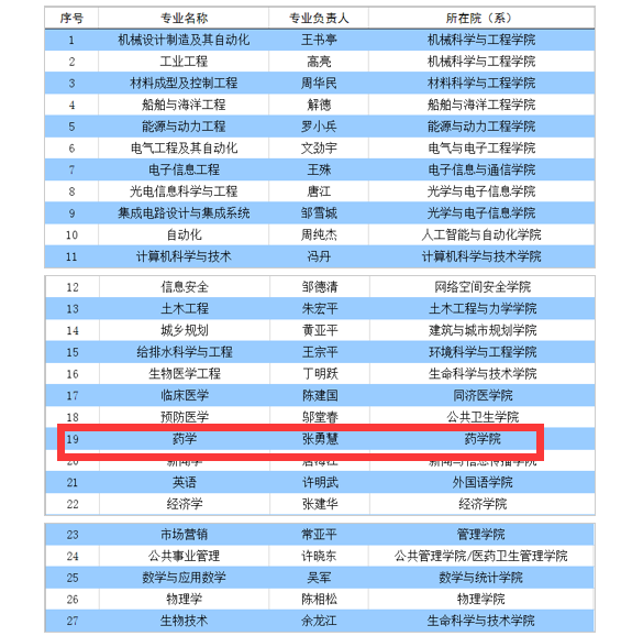 近日,教育部发布了《教育部办公厅关于公布2019年度国家级和省级一流本科专业建设点名单的通知》,我校有 27个专业入选国家级一流本科专业建设点,11个专业入选省级一流本科专业建设点,其中我院药学专业获批国家级一流本科专业建设点。