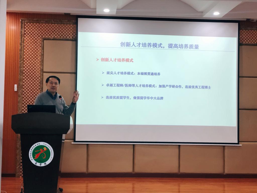 随后,项光亚解读了研究生院在2019年发布的《华中科技大学全面落实研究生导师立德树人职责实施细则》等10个文件。他进一步从招生、学籍管理、申请学位等方面阐述了新文件的政策变化,要求导师全面落实立德树人,鼓励大家积极拓宽研究生的国际学术视野,培养研究生实践创新能力,努力使我院研究生的培养质量再上一个台阶。