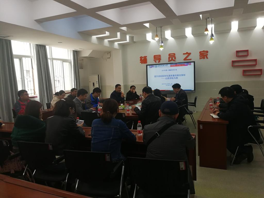 3月28日下午,2019年第一期医科辅导员沙龙在大学生活动中心102室举行。本次沙龙由医学学生工作处主办,药学院承办,主题是提升高校医科生源质量的路径探析。医科学工战线老师参加了此次沙龙活动。