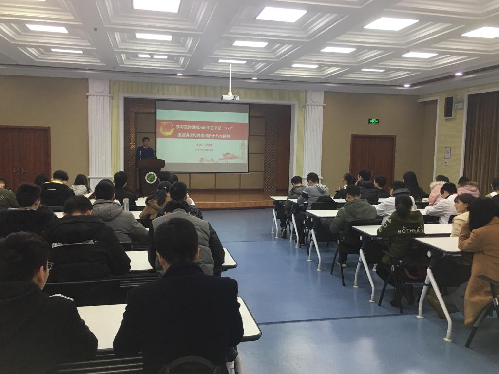 2018年12月24日下午,我院分团委举办了学习宣传贯彻习近平总书记“7.2”重要讲话和团的十八大精神宣讲会。药学院分团委及学生会主要学生干部、本硕博团支部书记、各年级团员代表共计120余人参加了此次宣讲会。会议由药学院分团委书记张润博主持。