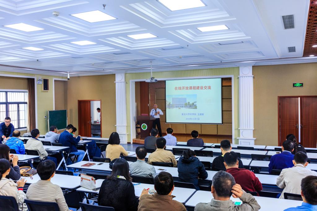 2018年11月1日上午,在药学院三号楼的五楼会议室召开了药学院在线课程建设交流研讨会,复旦大学药学院副院长王建新教授应邀出席会议。会议由药学院副院长项光亚教授主持,药学院全体教职工参加了会议。