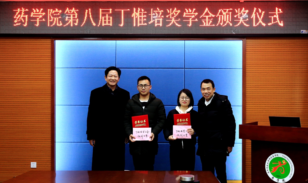 2018年1月22日下午,第八届“丁惟培奖学金”颁奖仪式在药学院二号楼一楼会议室举行。颁奖仪式由药学院党委副书记周正航主持,出席仪式的有药学院党委副书记厉岩、副院长向明、副院长项光亚、武汉大学李宗桃教授、药学院教师罗智、吕子敏以及辅导员和学生代表。