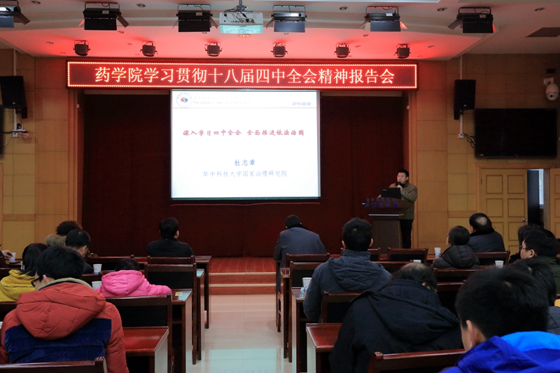 为深入贯彻落实十八届四中全会精神和习总书记系列讲话,更好的在全院开展坚持立法先行贯彻社会主义核心价值观的行动,2015年2月2日下午,药学院在同济医学院学术报告厅举办了一场学习贯彻十八届四中全会精神的报告会。本次报告会由华中科技大学国家治理研究院杜志章教授主讲,药学院全体教职工老师参加。