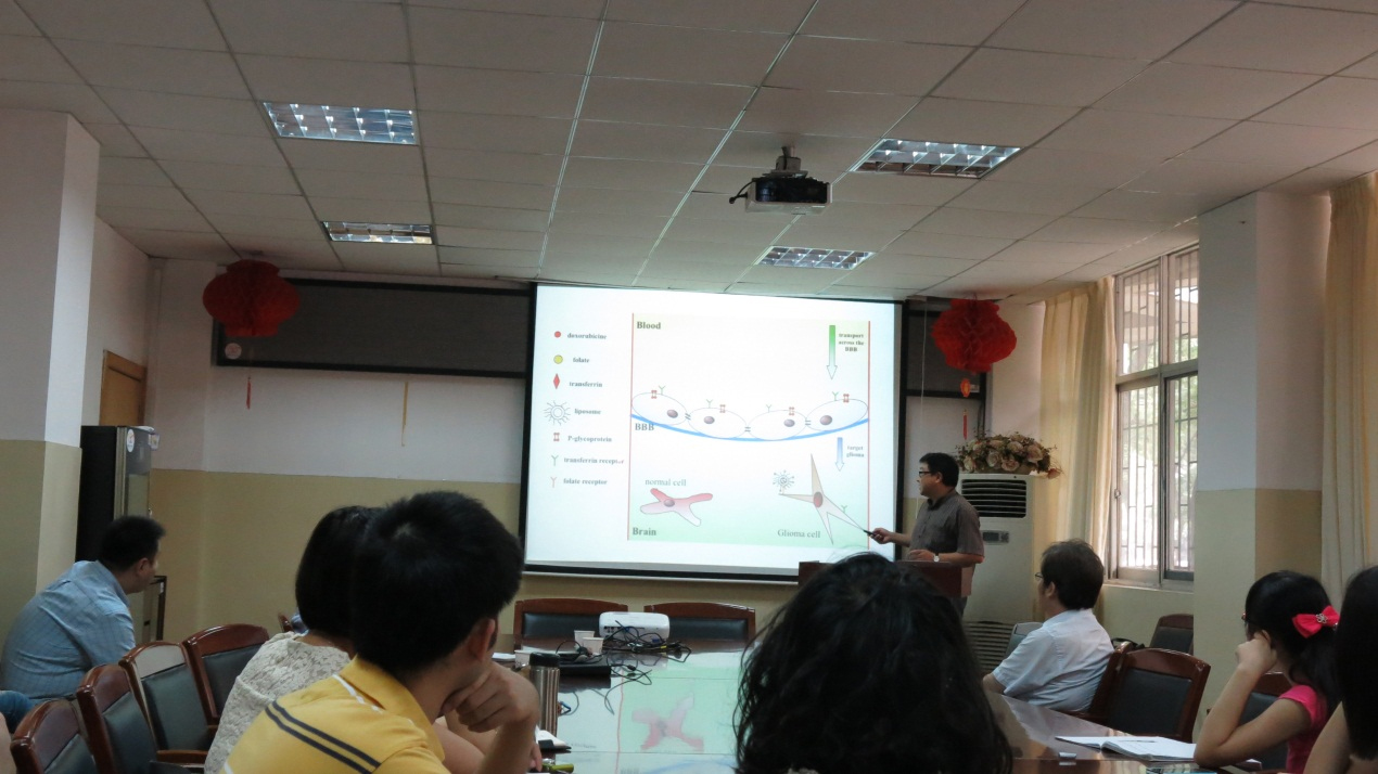 高建青教授是浙江大学药学院副院长,博士生导师,生物技术药物制剂研究室主任,兼任中国药学会药剂专业委员会委员,国家及浙江省食品药品监督管理局药品审评专家,国家新药创制重大专项二审专家,以及国家自然科学基金项目审评专家等。他主持国家自然科学基金资助项目多达5项,作为制剂主要研制人完成国家2类抗肿瘤新药研究1项,参与新药开发多项,在研国家一类新药制剂研究多项,获得国家发明专利9项。本次报告高教授主要跟我们交流了四个方面的工作:脑胶质瘤治疗;逆转肿瘤多药耐药;经皮免疫;间充质干细胞相关的基因治疗。尤其着重讲述了各个工作的一些机制性研究。高教授的报告非常精彩,内容充实,条理清晰,在场老师学生与高教授做了深入讨论。