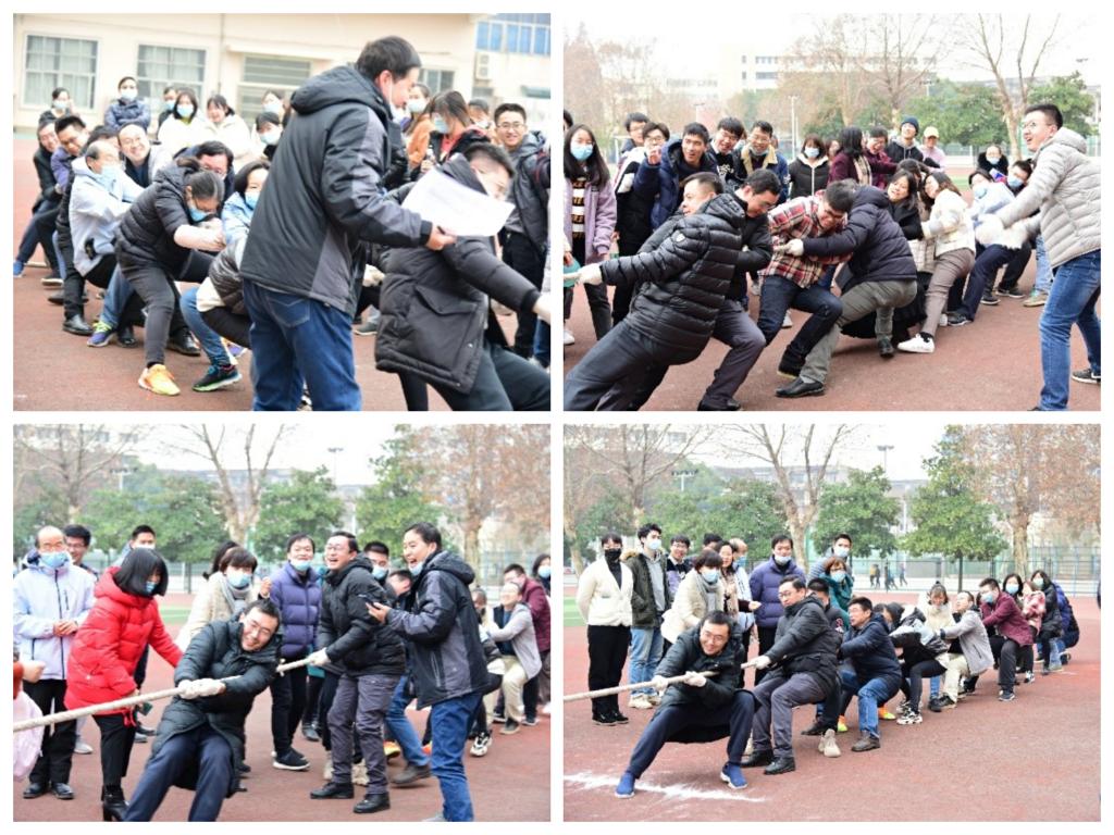 下午三点,备受期待的师生拔河比赛开始。首先进行的是2019和2018级本科生的较量,双方选手都全力以赴,跟随呐喊的节奏协同用力,最终2018级的同学更胜一筹,以2:0的好成绩拿下比赛;第二场是2017级本科生和研究生的较量,在比赛开始阶段,两队势均力敌,不分上下,随后研究生组在口号的调整下突然发力,以2:0的成绩赢得比赛。在教师队伍队内拔河热身赛比拼结束后,迎来了2018级本科生和研究生的冠军争夺战,双方实力强劲,比赛开始便进入白热化,双方陷入鏖战,僵持不下,最终在现场观众的呐喊声中,2018级本科生找准机会,打乱研究生组的节奏,最后以2:0的比分获得了比赛的冠军。最后一场焦点战是2018级本科生和老师们的友谊赛,双方队员摩拳擦掌摆好阵势,哨声一响,两支队伍全力以赴,比赛进入僵持阶段,双方不分伯仲你来我往,学生组在开始阶段占据优势,但是老师们后程突然发力,逐渐拿回主动权,最终赢得了比赛。