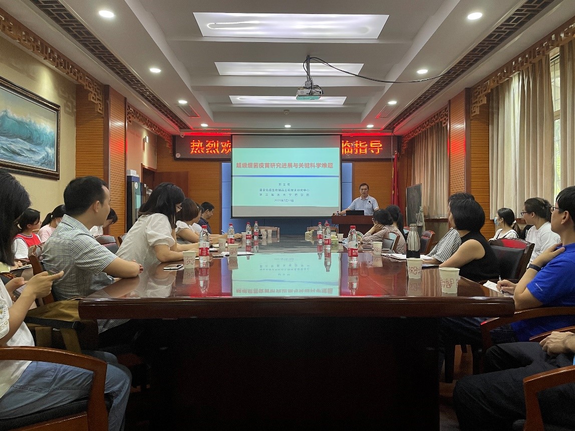 7月10日,第三军医大学邹全明教授受邀访问我院并在二号楼一楼会议室作了题为《超级细菌疫苗研究进展与关键科学难题》的学术报告,学院副院长项光亚主持报告会。