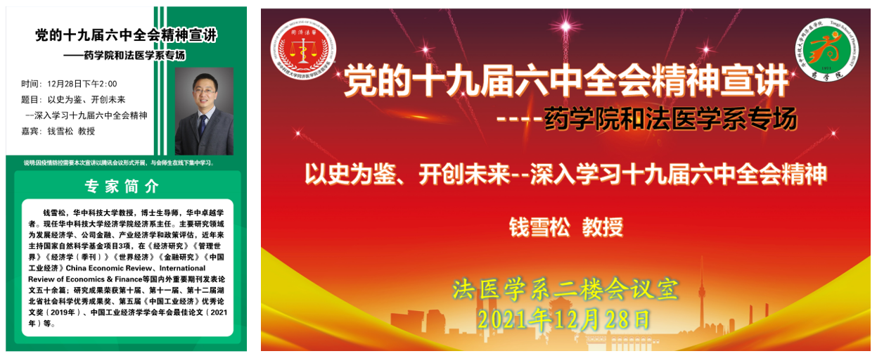 为深入做好党的十九届六中全会精神学习宣传,12月28日下午,学院联合法医学系邀请我校经济学院经济系主任钱雪松教授开展了学习十九届六中全会精神专题宣讲。按照疫情防控相关要求,本次宣讲以腾讯会议的形式开展,学院班子成员、各党支部书记、教师代表和学生代表共70余人在线上进行了学习。法医学系党委书记任学梅主持了本场报告会。