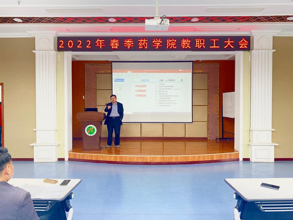 2022年是学院的人才培养年,厉岩从50周年院庆、中药与天然药物研究院、人才培养方案再设计、药学专业认证、招生就业工作等十项重点内容对学院2022年的工作思路和主要任务进行了详细的安排部署,并对本科生招生与就业工作深入进行了分析研判。院长张勇慧则对院庆工作、学院发展基金设立、专业认证以及联合办学等重点工作向全院教职工进行了阐释,并提出了高水平论文分布不平衡、新药思维不足等学院发展短板,他强调全院职工要“做”字当头,“实”字为要,切实补短板、强优势,将院党委既定的部署不折不扣地落到实处。