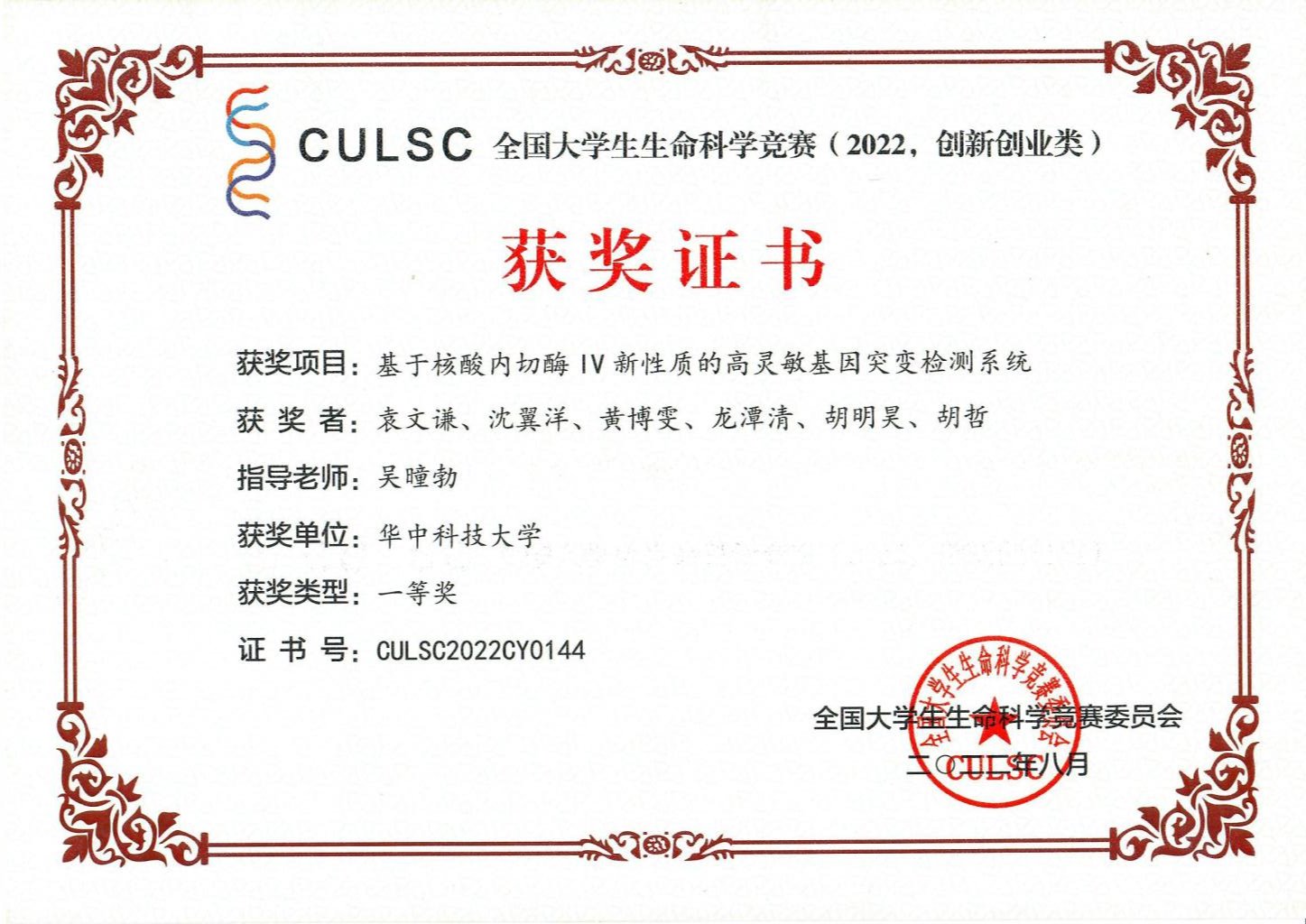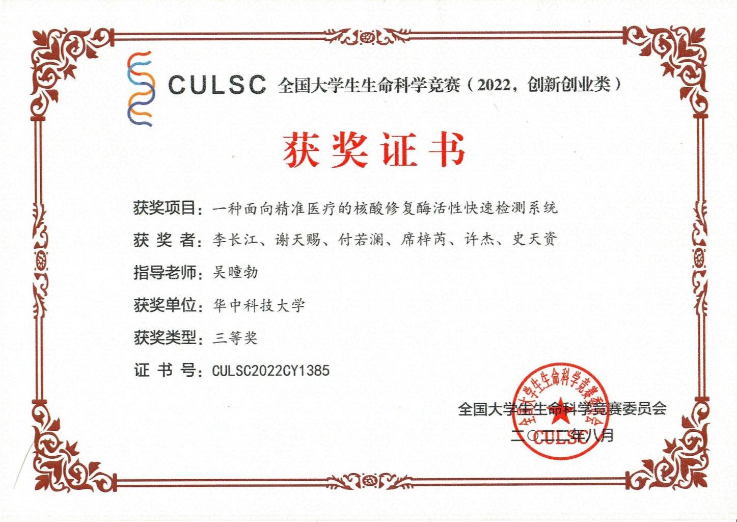 由吴曈勃副教授指导,李长江、谢天赐、付若澜、席梓芮、许杰、史天资参与的项目“一种面向精准医疗的核酸修复酶活性快速检测系统”获得三等奖。团队负责人李长江表示:“奖项是团队努力的结果,研究课题被老师与专家评委们给予肯定后大家都很有成就感。凡是过往,皆为序章,希望我们在以后的学习与研究工作中也能够百尺竿头更进一步!”