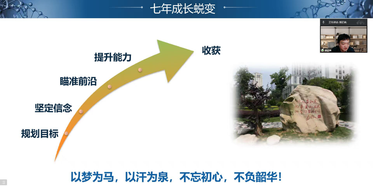 年会交流环节,胡正喜以“不忘初心 砥砺前行”为主题进行个人成长经验分享。胡正喜曾作为报告人参加了药学院第一届研究生学术年会,在本次分享会中,他讲述了自己是如何在七年的时间里从一名博士成长为国家级人才。他同时鼓励研究生坚定科研信念,提升科研能力,以梦为马,以汗为泉,不忘初心,不负韶华!