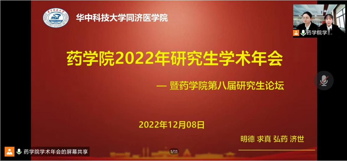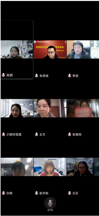 12月8日下午,药学院2022年线上研究生学术年会暨药学院第八届研究生论坛成功举行。学院党委副书记李进、院长助理朱虎成、硕士生导师胡正喜、实验安全管理员张伟、研究生教务员汪继红、张智勇和辅导员张心语出席了会议,会议由学院研究生会学术部黄志红和朱瑞雪主持,全体研究生参加了此次会议。