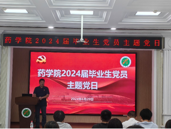 为激励学院毕业生党员坚定理想信念、厚植爱党爱国情怀,以良好的精神风貌踏入新的征程,2024年6月20日下午,学院在药学院三号楼五楼会议室开展2024届毕业生党员主题党日活动。药学院院长张勇慧、党委副书记李进、党建辅导员张心语出席本次活动。本次活动由李进书记主持,全体毕业生党员参加。