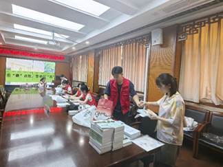 8月30日下午,志愿者学长学姐们来到学院迎新点布置现场,整理物品、资料,调试设备。