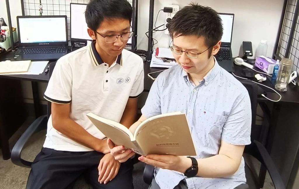 吴曈勃(右)指导学生学习批判性思维。吴曈勃供图