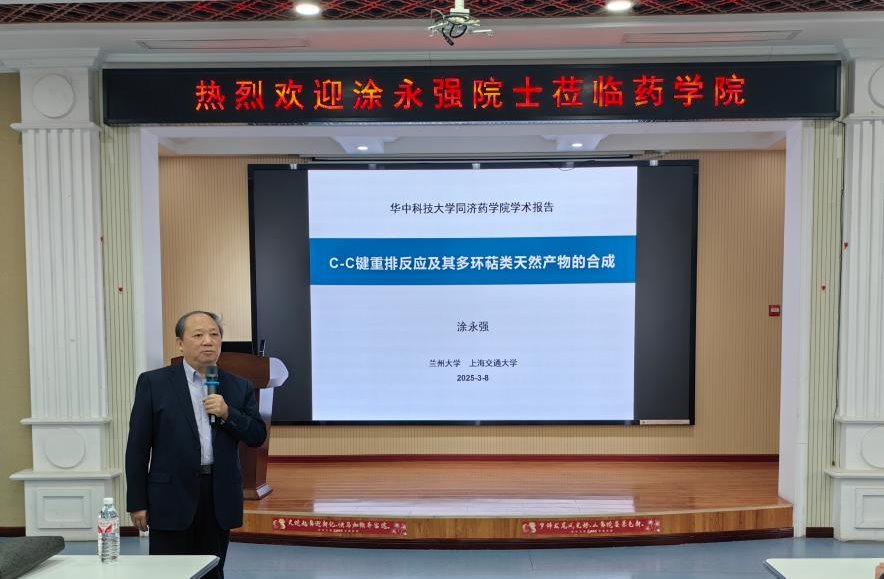 2025年3月8日上午,中国科学院院士、著名有机化学家涂永强教授应邀莅临药学院,并在药学院3号楼5楼报告厅作了一场题为“多环萜类天然产物的合成”的精彩学术报告,华中科技大学副校长张勇慧教授参加活动。本次报告由药学院万谦教授主持,药学院及化学化工学院百余名师生到场聆听。