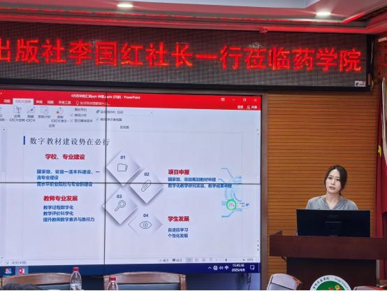 黄锐书记与李国红社长就教材编写和出版流程进行深入探讨。在教材编写过程中,可借助AI工具进行知识梳理和分析,构建知识图谱,使教材内容的结构更加清晰、逻辑更加严谨,还可以利用AI监测药学领域的最新研究成果和行业动态,并及时融入教材,确保教材内容的时效性和先进性。