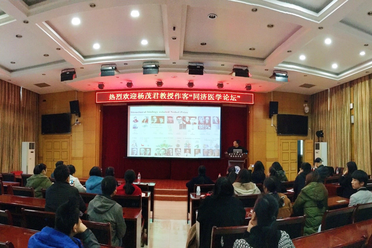 2017年11月20日下午,受我院李华教授邀请,长江学者特聘教授、国家杰出青年基金获得者、清华大学生命科学院杨茂君教授来我院进行了题为“呼吸的分子基础”的学术报告。报告会由李华教授主持,药学院、基础医学院和公共卫生学院的部分教师、各年级研究生和部分本科生参与了交流。杨茂君教授深入浅出地讲解了—人源线粒体呼吸链复合物的结构生物学研究对理解细胞呼吸的分子机制的重要意义,并详细讲述了他是如何一步步获得 “人源超级复合物I2III2IV2的高分辨结构”,其研究成果先后在《Nature》、《Cell》及各类国际顶尖期刊上发表,其在《Cell》杂志封面上将中国古代文化龙图腾与“蛋白质复合物对称的结构”进行比拟,引人入胜。通过结构及生化数据分析,提出了一个更为合理的与占据学界长达40年之久的经典的Q循环理论所不同的电子传递机制,改写了教科书。这一系列论文逐步揭开了线粒体呼吸链神秘的面纱,是国际范围内首次获得的人源呼吸链超级以及超超级复合物的结构,为攻克阿兹海默综合症、帕金森综合症等线粒体缺陷相关的疾病提供了重要的技术和理论支持。