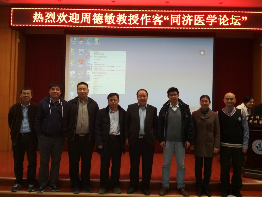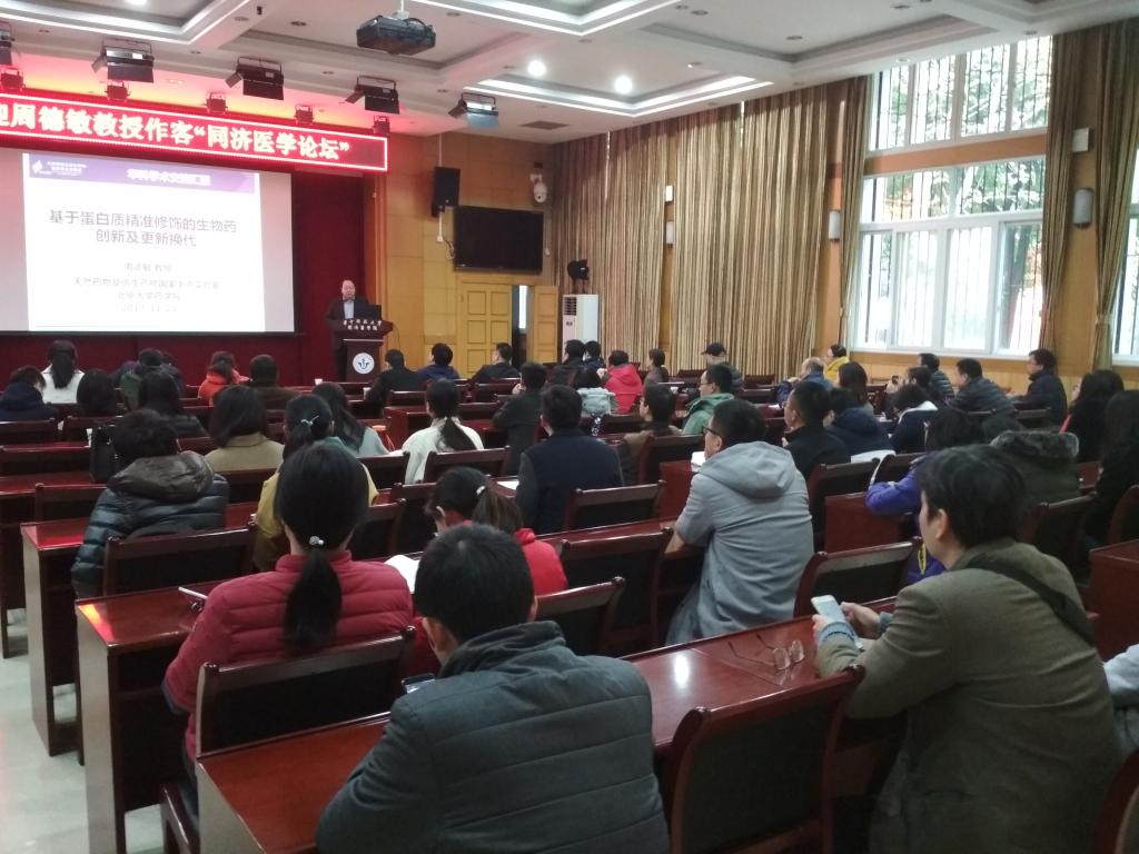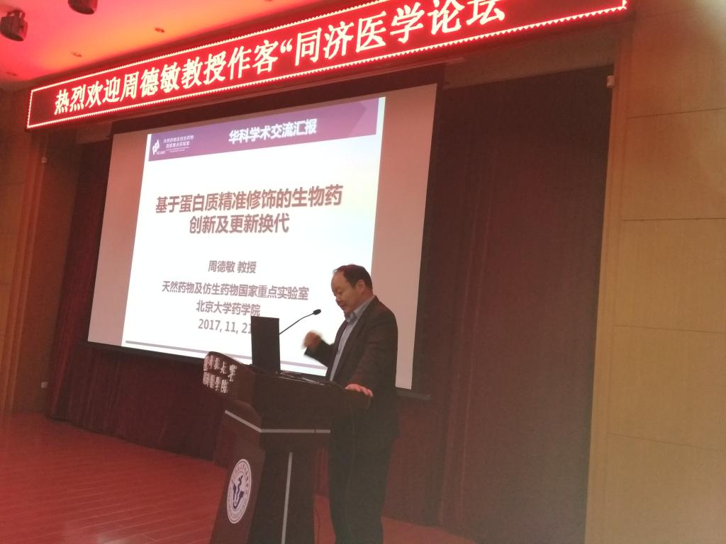 2017年11月21日下午,受药学院邀请,北京大学药学院院长周德敏教授在学术报告厅作客同济医学论坛,带来了题为“基于蛋白质精准修饰的生物药创新及更新换代”的学术报告,周教授系统讲解了利用“蛋白质精准修饰“的方法实现生物药创新与更新换代,这项技术实现了多个领域内的重大突破,不仅打破了蛋白质药物开发的瓶颈,更是实现了整体无毒病毒作为疫苗,是该领域的革命,有望成为活病毒疫苗制备的通用方法。周老师的讲解阐述了化学与生物学整合对药物研发的重要性,使参会师生受益匪浅。报告由药学院副院长项光亚教授主持,医学学科与发展规划办公室主任黄昆教授、药学院院长张勇慧教授、副院长向明教授、万谦教授及同济医学院各院系老师与学生参加报告,报告现场学术气氛浓厚,交流热烈。