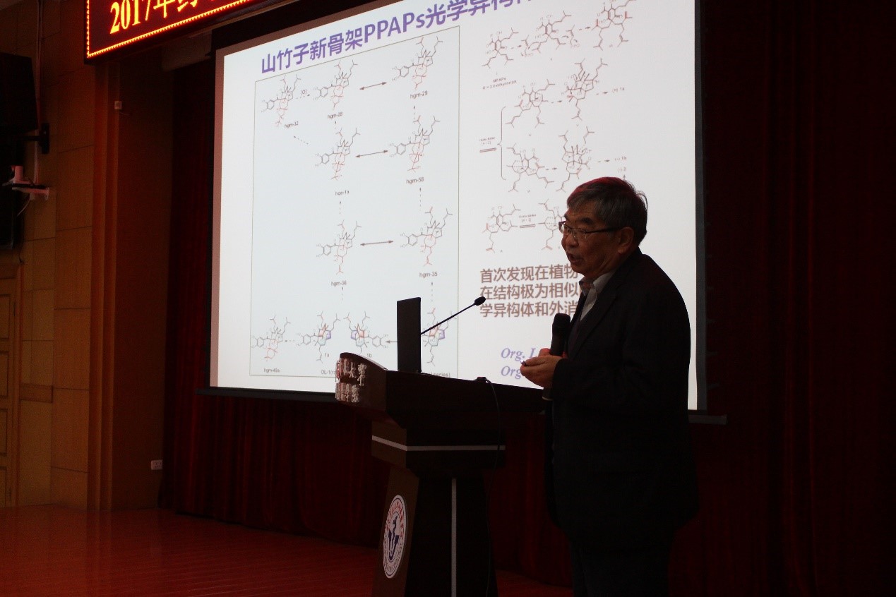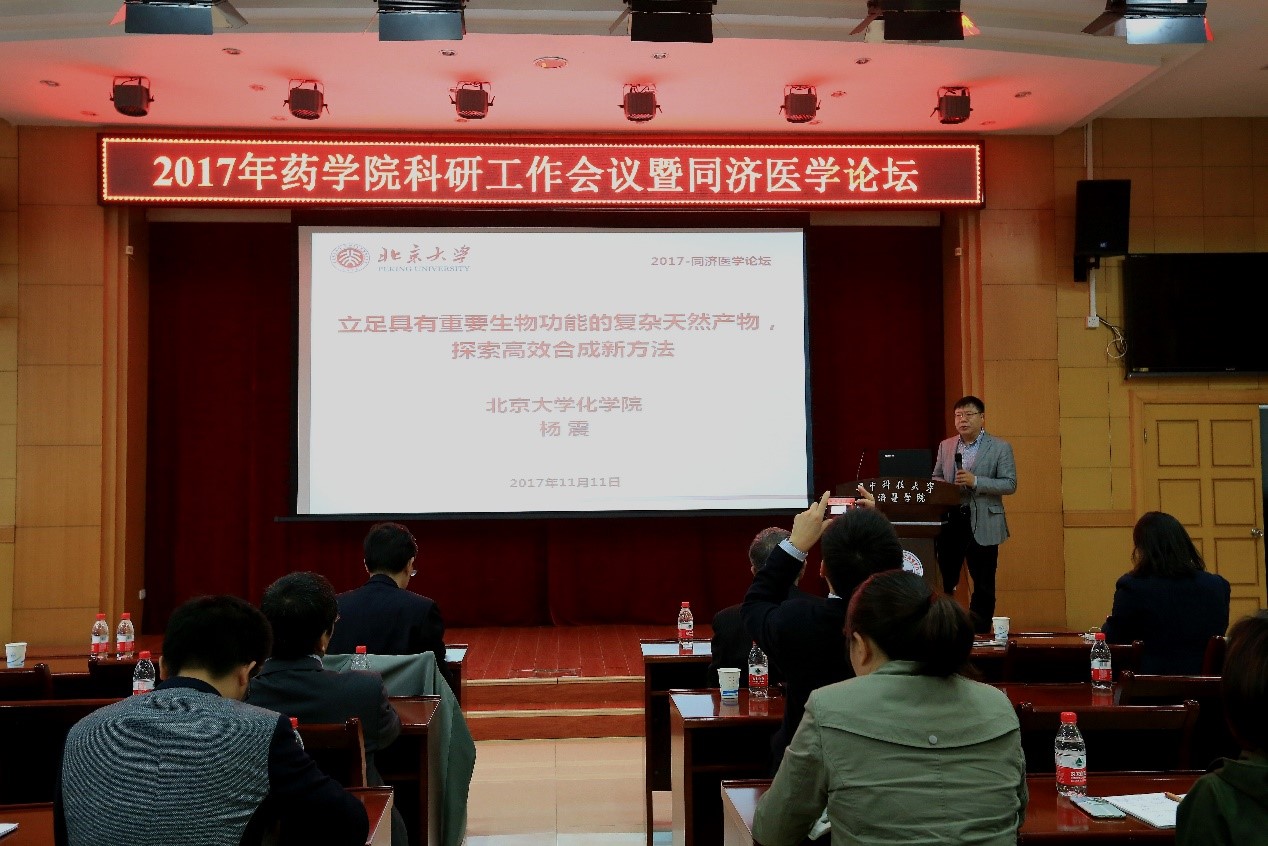 2017年11月11日上午8点30分,药学院在医学院报告厅召开了2017年科研工作会议暨同济医学论坛学术报告,会议邀请到了中国科学院上海有机化学研究所林国强院士、中科院昆明植物研究所郝小江教授、北京大学杨震教授、上海交通大学徐宇虹教授来我校进行学术讲座。林国强院士是我国有机合成领域的大家,他结合其课题组几十年来在天然产物合成、合成方法学以及产品开发方面的发展历程和经历,阐述了科学研究思维训练在人才培养中的重要性以及祖国传统医药学在新药研发中的潜在价值。林国强院士曾多次获得上海市、科学院以及国家级重要奖项,尤其令人敬佩的是,林院士的研究成果产生的巨大的社会和经济价值。林院士的报告科学严谨,又不失幽默风趣,赢得师生的一致好评。郝小江教授的报告讲述了基于植物保护和植物防御体系建立起来的活性天然产物研究,从植物中得到了上百种新骨架化合物并对其生物功能进行了广泛的研究。此外,郝教授对目前天然产物研究领域面临的机遇和挑战提出了自己的真知灼见,与会者深表受益良多。杨震教授给药学院全院师生做了题目为“立足具有重要生物功能的复杂天然产物,探索高效合成新方法”的学术报告,内容包括对一系列结构复杂生物活性良好的降三萜类天然产物的全合成,整个报告思想性和学理性兼具,赢得了在场师生的一致认可。徐宇虹教授讲述了课题组长期以来研究的一种新型电脉冲方式导入的DNA疫苗,用于HIV和肿瘤治疗,目前正处于临床研究阶段。随后药学院黄昆教授、万谦教授、张志平教授也分别带来了题为“APJ in kidney diseases”、“基于亚砜的糖苷化反应及其在天然产物合成中的应用”、“基于药物递送系统的肿瘤联合治疗研究”的研究报告,向参会嘉宾展现了我院年青学者的风采,给他们留下了深刻印象。报告由药学院副院长项光亚教授主持,药学院院长张勇慧教授、厉岩书记、副院长王凯平教授、向明教授、万谦教授及同济医学院各院系老师与学生参加报告,整个学术报告历时近四个小时,报告厅座无虚席,与会者在浓厚的学术氛围中度过了特别的“双十一”。