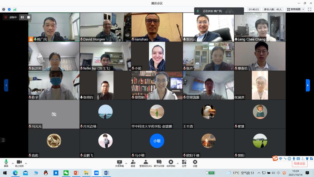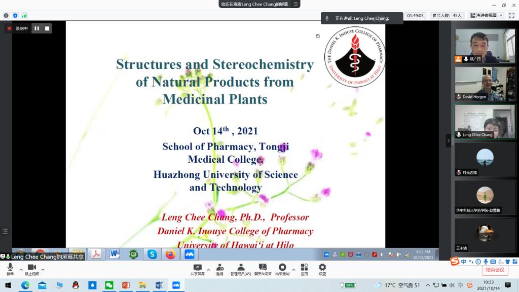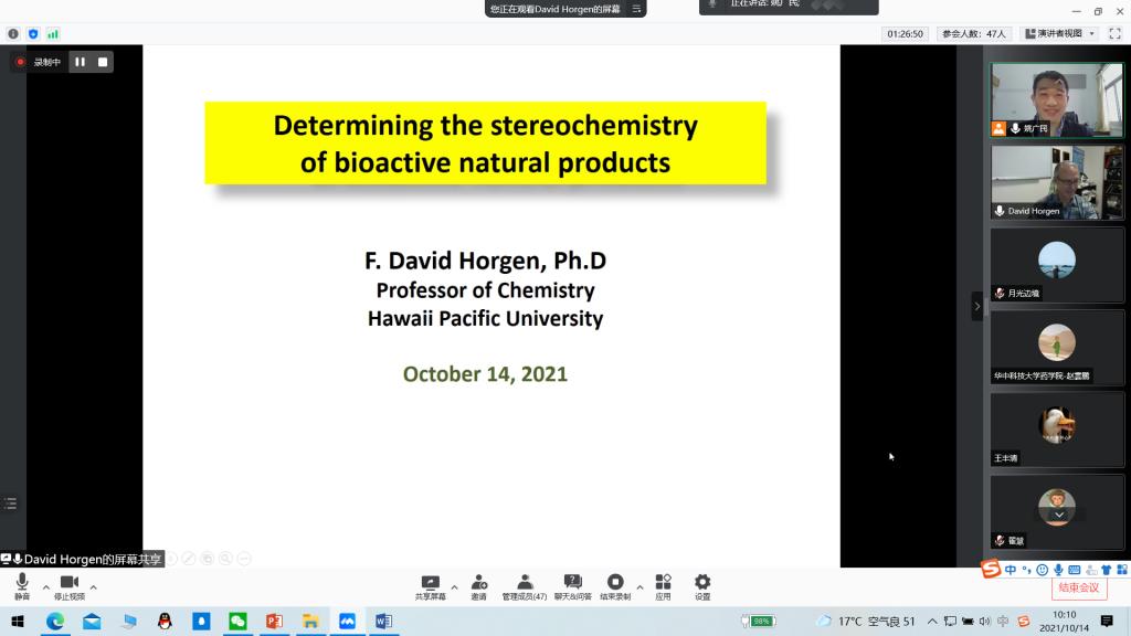 10月14日,夏威夷大学药学院Leng Chee Chang教授和夏威夷太平洋大学自然科学学院F. David Horgen教授应邀在腾讯会议线上平台为全院师生做了精彩报告。报告会由《药物立体化学》课程负责人姚广民教授主持,学院阮汉利教授等47名师生在线参加。