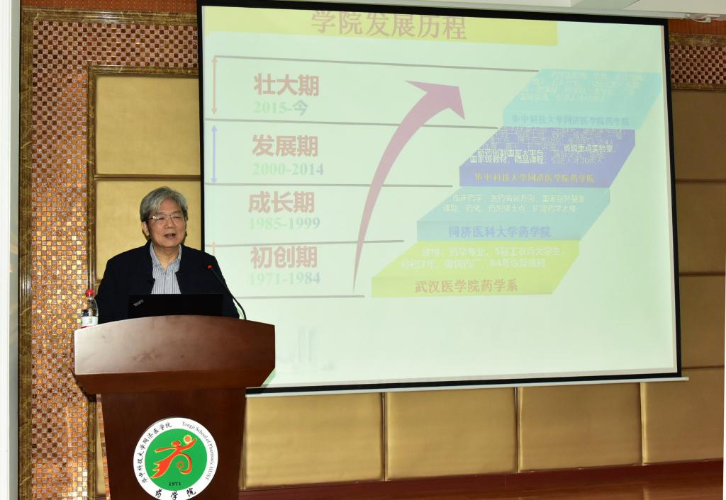 李高教授的院史报告以《传承·奋进五十年》为题,他首先简短回顾了自己在药学院46年的求学与工作经历,表达了对学院深厚的情感,接着从初创、成长、发展和壮大四个阶段深情回顾了学院五十载的发展历程,其中有武汉医学院药学系时期初创的艰辛,也有同济医科大学药学院时期扩建药学大楼、学科建设等方面取得长足进步的欣然,有合校后成功申报国家级专业、搭建国家级新药创制平台、参与国家级教材编制和精品课程建设的喜悦,也有壮大期开办双一流课程、人才培养取得累累硕果以及国际交流、引进人才不断增强带来的自豪。他凝练地总结了学院五十年的发展贡献,精彩解读了“明德求真 弘药济世”的院训精神,使在场教职工深切感受到了五十年发展历程中药学人一脉相承的奋斗精神和济世情怀。李高教授随后以“自强不息 厚德载物”为核心内容分享了自己对工作和生活的感悟,他希望全院教师要不断拼搏,做最好的自己,依托优质平台不断成就自身并始终保持良好的身心状态,快乐工作;要有大智慧,学会逆向思维,深怀敬畏与悲悯之心,懂得宽容与感恩,从而使心情愉快,生活幸福。