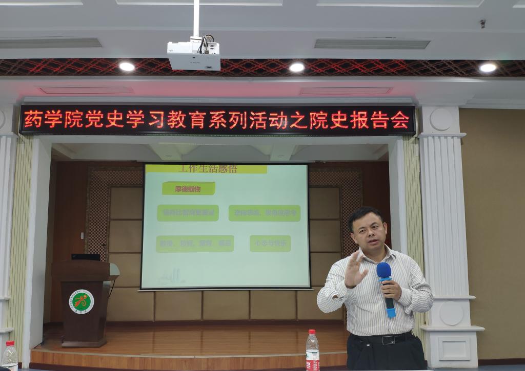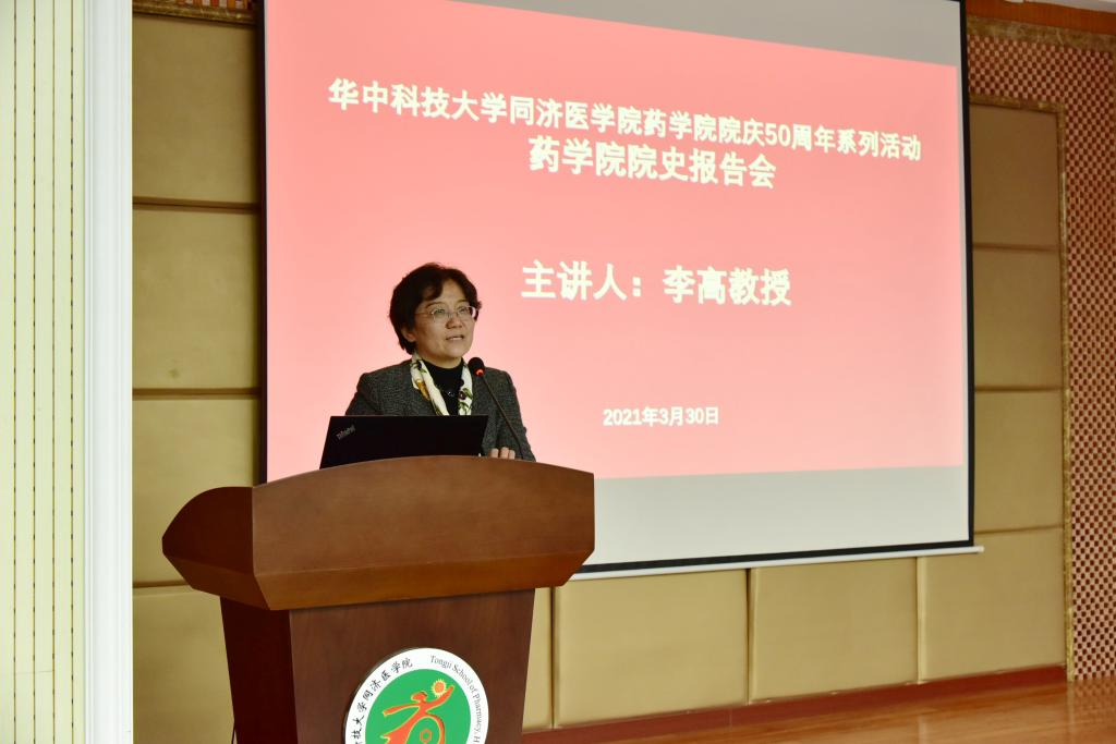 为纪念中国共产党成立一百周年和学院建院五十周年,深入开展党史学习教育活动,3月30日下午,药学院在三号楼报告厅举办党史学习教育暨院庆五十周年系列活动之院史报告会,邀请学院退休教师、原院长李高教授讲述学院历史,回顾学院发展历程。学院党委书记厉岩主持报告会,学院全体教职工到场聆听。
