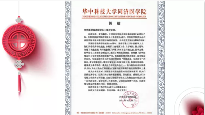 同济医学院校友会也发来了贺信,主持人晏雪鸣进行宣读,同济医学院校友会首先对药学院长三角校友会的成立表示祝贺,并感谢校友们对母校工作的关心和贡献,也衷心希望药学院长三角校友会和校友们进一步关注母校、支持母校、共建母校。