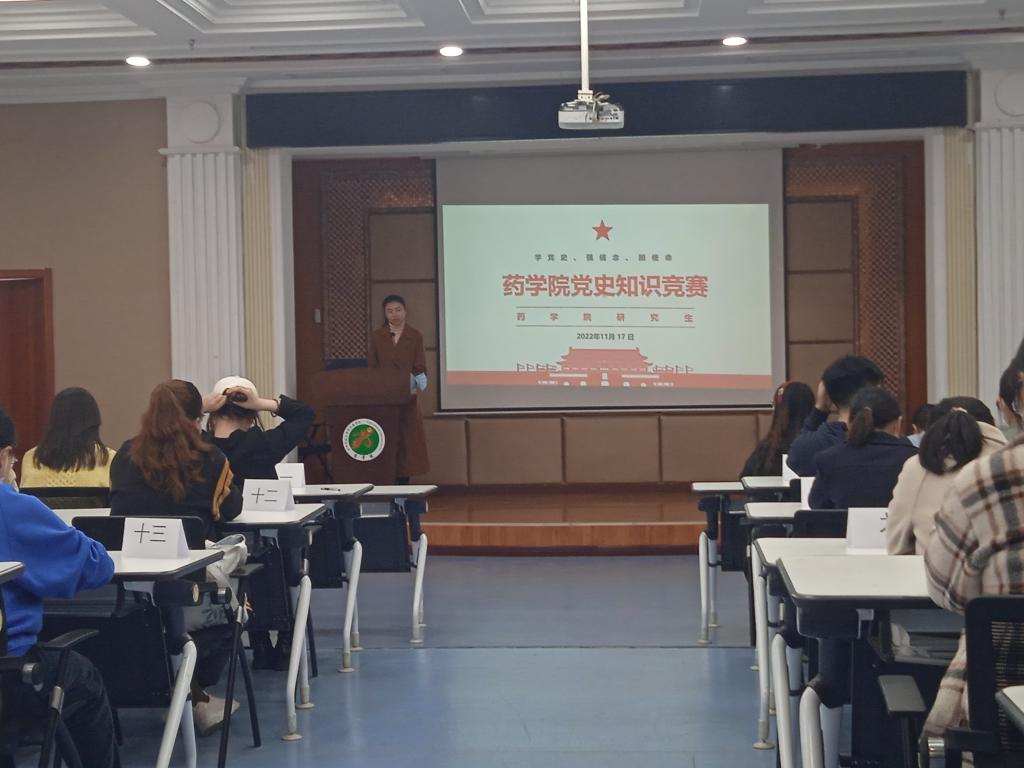 为深入学习贯彻党的二十大精神,巩固拓展党史学习教育成果,,教育引导广大学生把学党史、用党史作为终身必修课。2022年11月17日中午,药学院研究生“学党史·强信念·担使命”党史知识竞赛在药学院三号楼5楼会议室顺利举行。研究生辅导员张心语、学生评委及各研究生党支部参与了本次比赛。本次比赛由党支部书记阎旭主持。