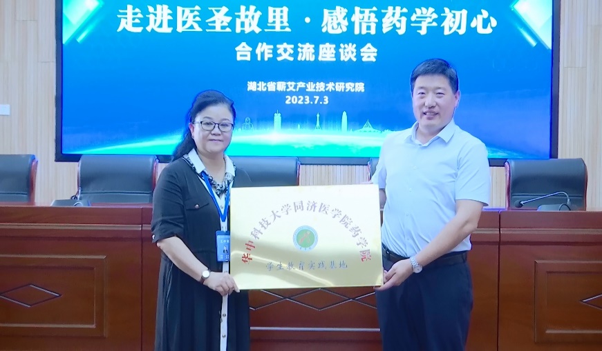 在观看征途蕲春蕲艾产业三十年视频、蕲艾研究院宣传片后,蕲春县委组织部副部长陈乾对我院暑期社会实践团队的到来表示热烈欢迎,并表示今后要加强药学院与蕲春县的交流合作。蕲艾产业技术研究院院长袁琴介绍了研究院目前概况,研究方向以及取得的成果进展等。我院李进书记为蕲艾产业技术研究院授牌,在研究院建立“学生实践教育基地”。